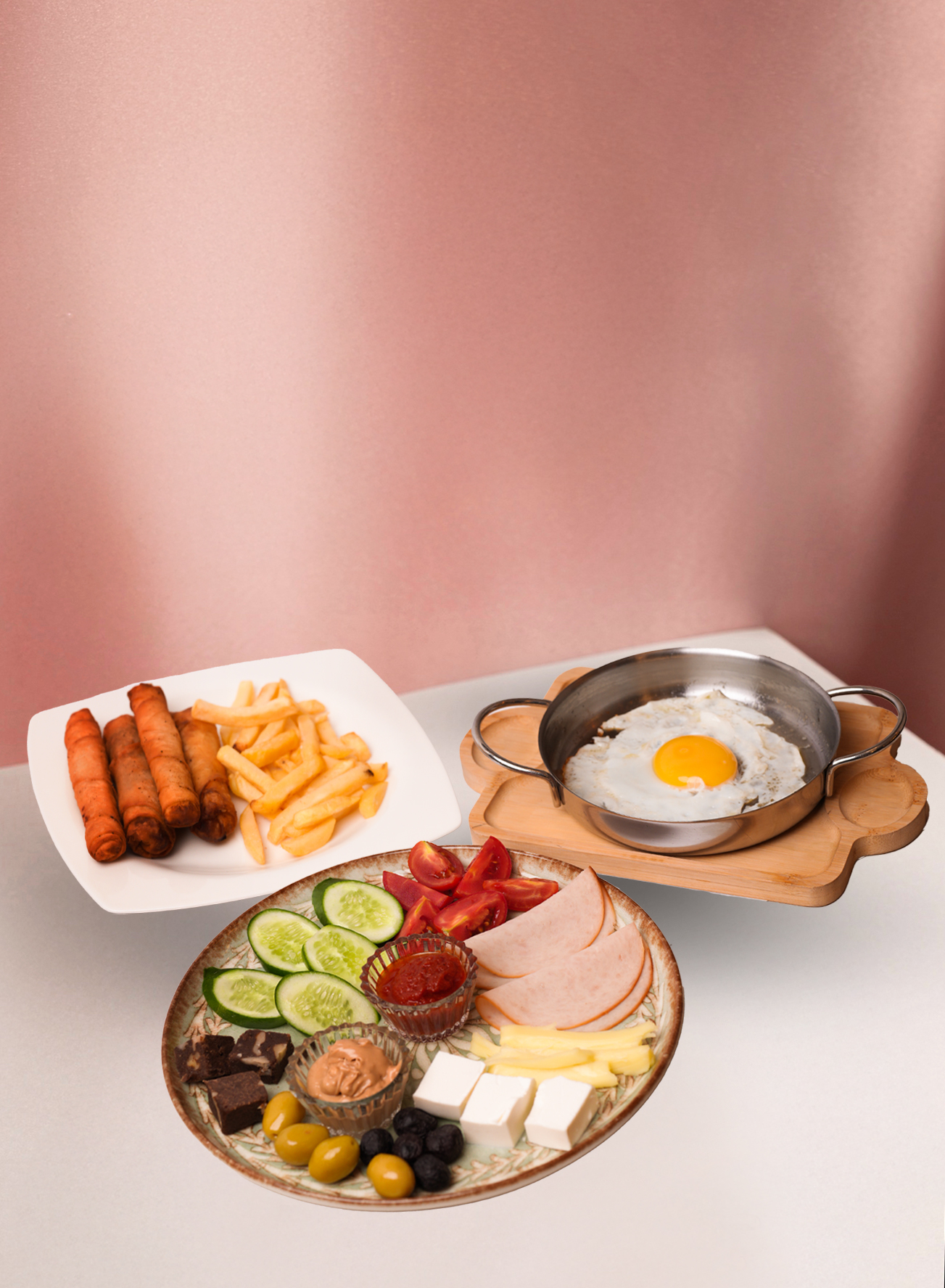 Domates, salatalık, siyah zeytin, beyaz peynir, kaşar peynir, dana macar, hindi füme, badem ezmesi, fındık ezmesi, patatesli paçanga böreği, yumurta ve sınırsız çay